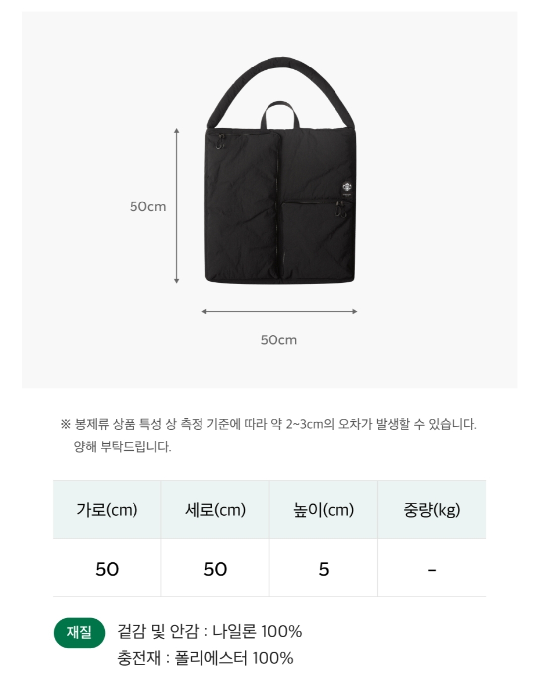 가로, 세로 50cm면 진짜 사이즈 넉넉한 겁니다. 겉감이나 안감이 나일론이라서 안들어봐도 엄청 가볍다는 걸 알 수 있네요. 가볍고 실용적인 겨울 가방으로 딱인 것 같습니다. 사이즈가 넉넉해서 보부상들에게 인기가 많겠네요.